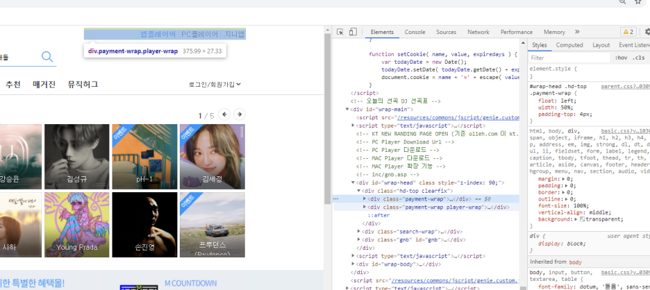 예전에는 아무 생각 없이 사이트에 방문하곤 했었는데 수업을 들으면서 배우는 게 생기다 보니 어떤 사이트든 들어가면 가끔씩 개발자 도구를 열어보게 된다. 아는 것보단 모르는 게 많지만 아는 태그가 나오면 정말 반갑다. 오늘은 내가 코딩할 사이트인 지니를 개발자 도구를 사용해서 둘러보기로 했다.