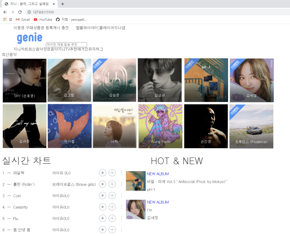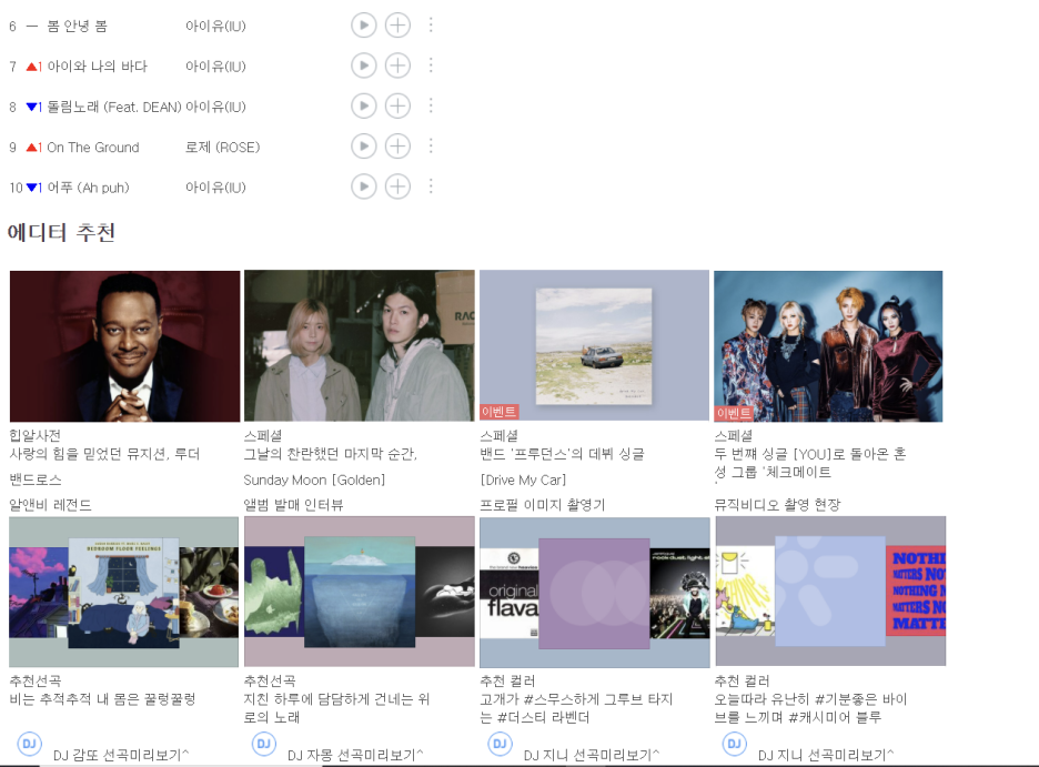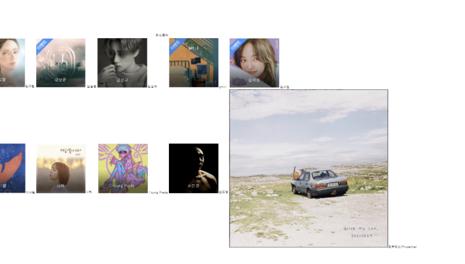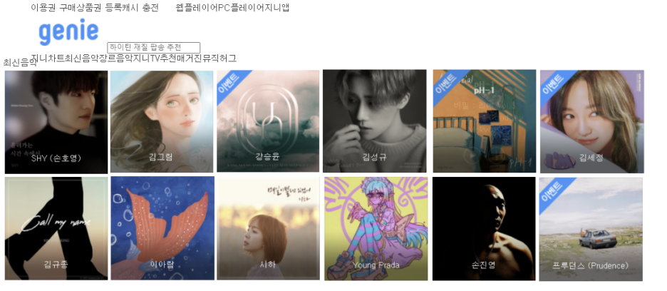 그래서 그냥 지니 사이트 홈에서 사진과 가수 이름이 나오는 상태로 바로 캡처해서 사진만 넣었다... 어떻게 하면 글자를 사진 위에 뜨게 할 수 있을지 알아봐야겠다.