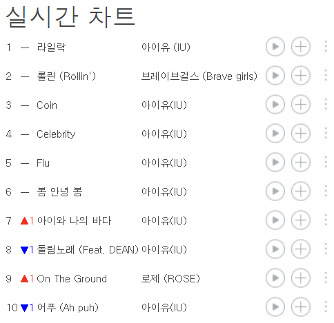 위의 코드를 실행하면 위의 사진에서 아이유의 라일락 부분만 뜬다. 나머지 곡들은 <tbody>의 <tr>부분을 복사해서 적힌 내용들은 변경해 주면 된다. 참고로 위에서 언급했듯이 오늘은 사이트의 모양새를 따라 하는데 초점을 맞춰서 아무 기능도 없다. 노래 옆에 뜨는 재생, 추가 버튼 부분은 아직 어떻게 구현해야 할지 잘 몰라서 사이트에서 저 부분만 캡처해서 사진을 넣은 것이다. 계속 실습하면서 저 부분을 사진이 아니라 실제로 구현할 수 있도록 고민해야 한다.