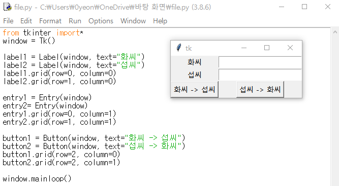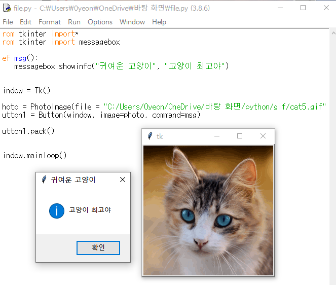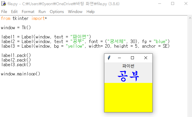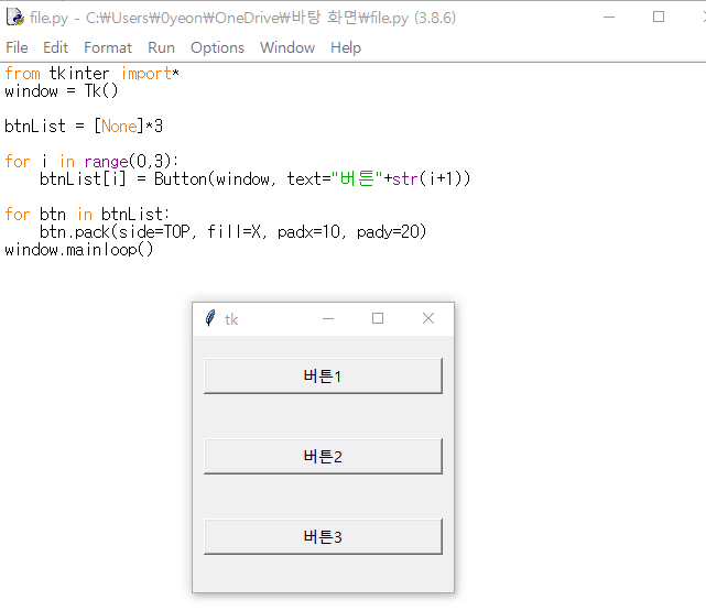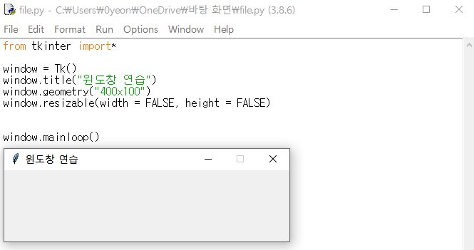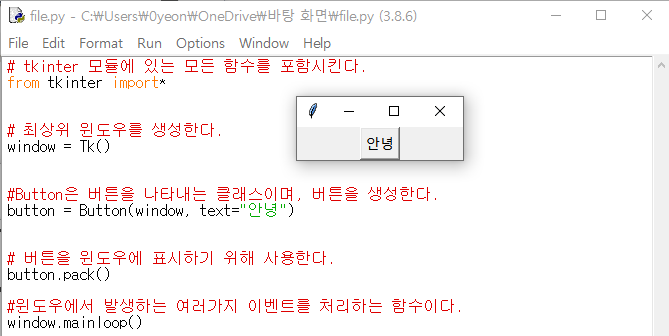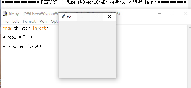 2행 : Tk()는 기본이 되는 윈도를 반환, 이를 루트 윈도 또는 베이스 윈도라고 한다. 베이스 윈도를 window 변수에 넣는다.
