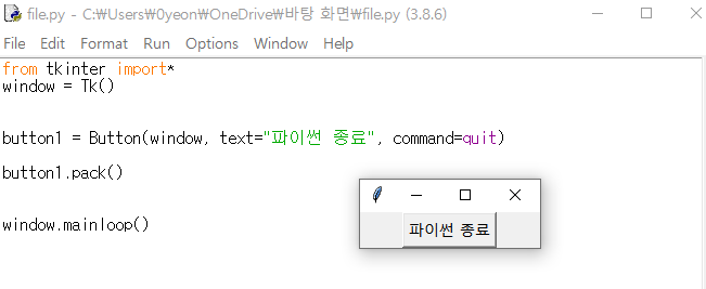 버튼을 누르면 파이썬 IDLE이 종료된다.
