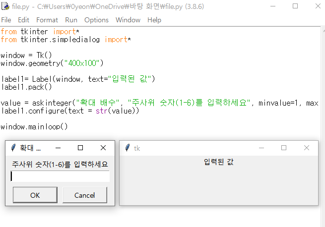 : tkinter.simpledialog 모듈을 임포트한 후 askinteger() 및 askstring() 등을 사용한다.
