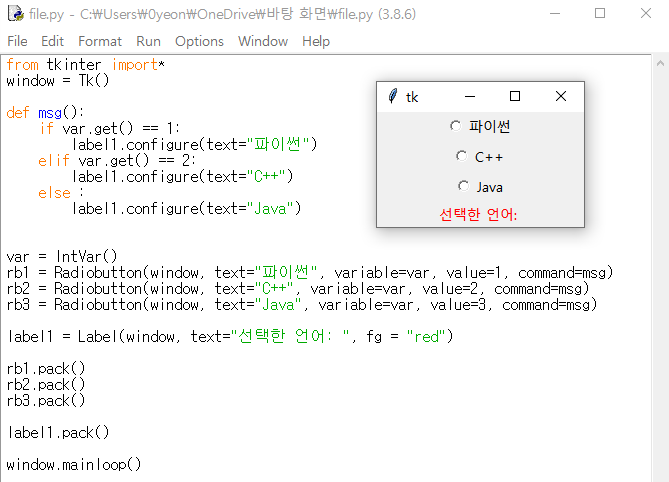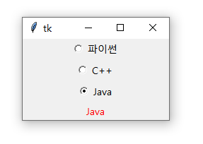 라디오 버튼(Radiobutton) : 여러 개 중에서 하나를 선택하는 데 사용하는 위젯