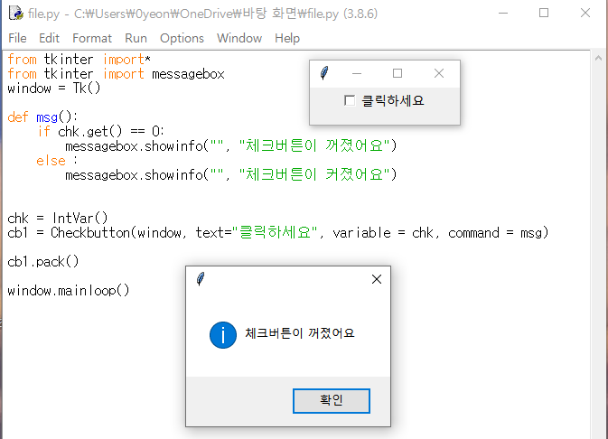 - 체크 버튼(Checkbutton) : 켜고 끄는 데 사용하는 위젯