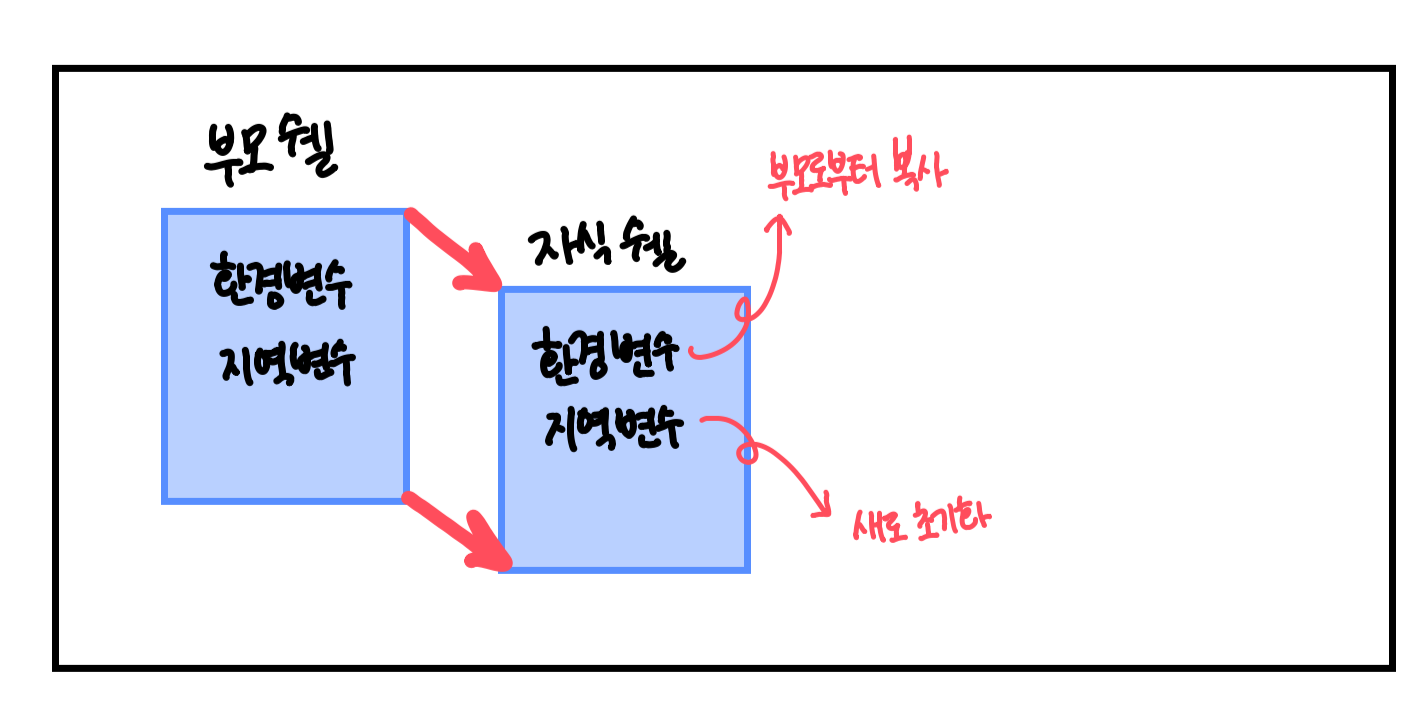 - 환경 변수는 값이 자식 프로세스에게 상속되며 지역변수는 그렇지 않다.