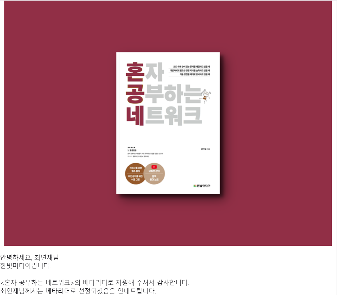 베타리딩한 자료를 다시 한빛미디어 측으로 송부하고 구글폼을 작성하면 베타 리딩 자체에 대한 활동이 종료됩니다! 책이 출판되고 나면 실물책 한 권을 배송해주십니다. 책 안에 제 이름이 쓰여있는데 감회가 새로웠습니다. 개인적으로는 정말 추천하는 활동이고 혹시나 베타 리딩을 고민하시는 분이 있다면 도전해 보시길 추천드립니다.