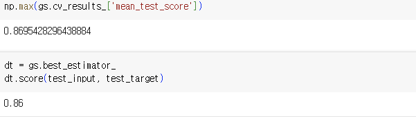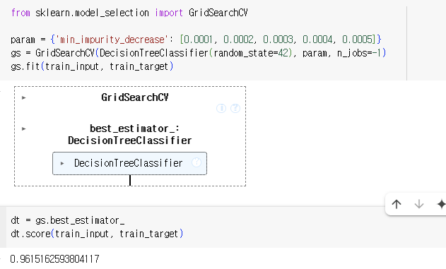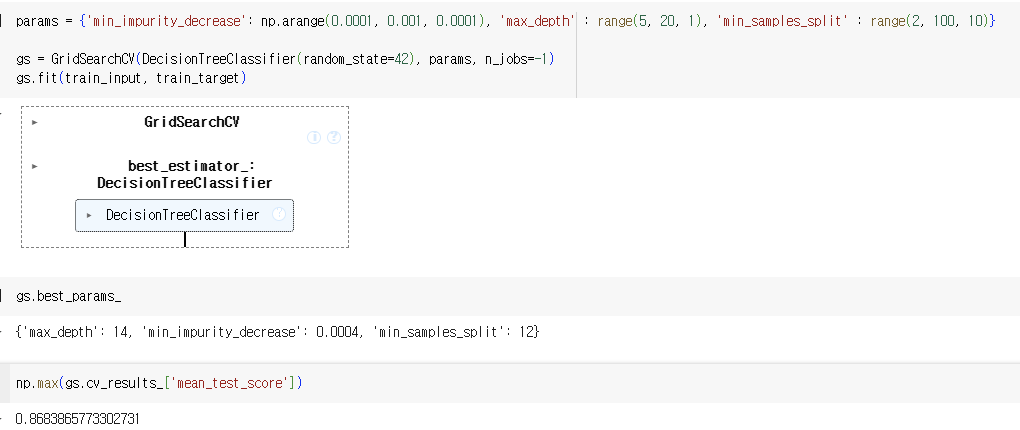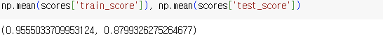 - 그 다음 훈련 세트에서 그리드 서치를 수행하여 최상의 평균 검증 점수가 나오는 매개변수 조합을 찾는다. 이 조합은 그리드 서치 객체에 저장된다.