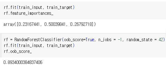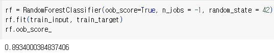 - 랜덤하게 선택된 샘플과 특성을 사용하기 때문에 훈련 세트에 과대적합되는 것을 막아주고 검증 세트와 테스트 세트에서 안정적인 성능을 얻을 수 있다.